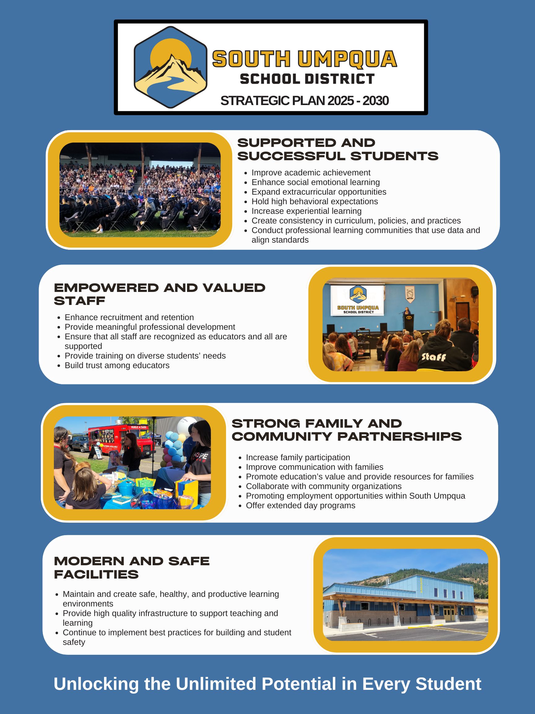 As we move forward, we recognize that this plan is not just a document—it is a shared commitment. We are all invested in the success of our students, engaged in the work ahead, and accountable for creating an educational environment that fosters growth, learning, and opportunity. Together, we will make a lasting impact on the future of South Umpqua School District.